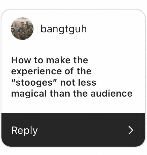 When I think about dual reality in stage magic, I think about the Q&A routine in which a mentalist reads the minds of those in the audience and reveals facts that were definitely not written on the cards before the show. The most powerful part of a Q&A routine is when the mentalist supposedly diverts away from what was meant to be written on the card, usually a question, and starts revealing information they could not possibly know.