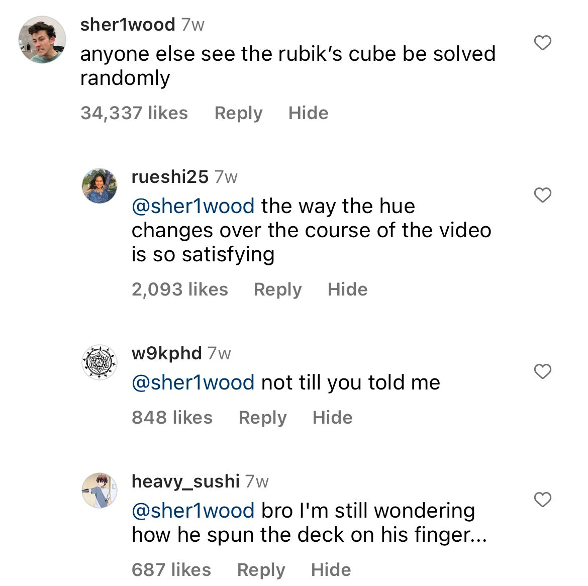 Multiple comments from users spotting solved Rubik's cube