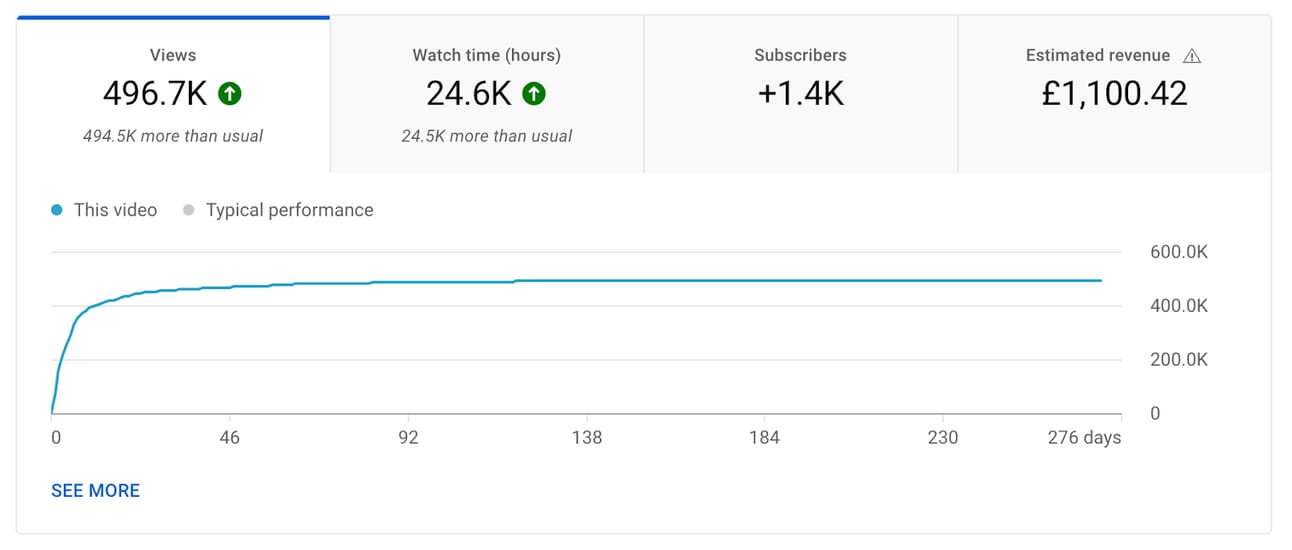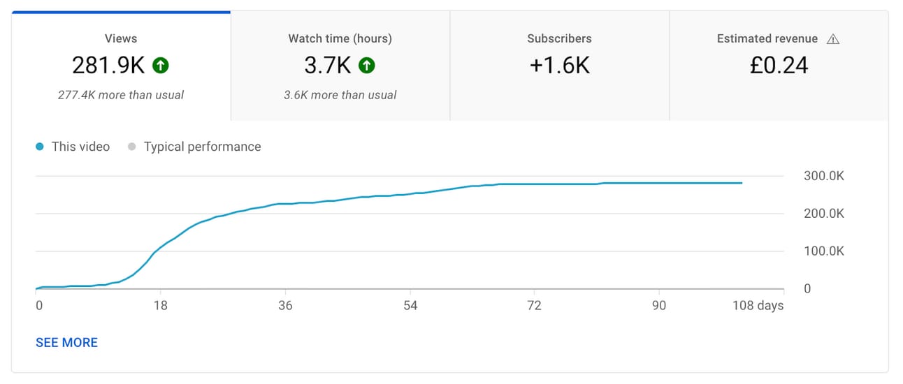 The stats look good, though. The whole aim of YouTube as a creator is to make videos that keep people on the platform. That means making videos that people want to click on and that also hold their attention for as long as possible. Even looking at the stats above, you can see the average view duration and click-through rate (percentage of people who clicked on the video after it was recommended to them) are in the green - meaning it's a solid video.
