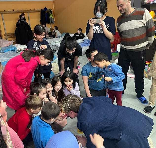 That was on Friday morning. And everyone told me I was mad. But, by Friday evening, I was in the centre of Lublin, a Polish town 60km from the Ukrainian Border. Equipped with some warm clothes and a box of child-friendly magic, I met a man called Rob, who I had found through the Polish Red Cross. He, too, thought I was mad but was kind enough to help.