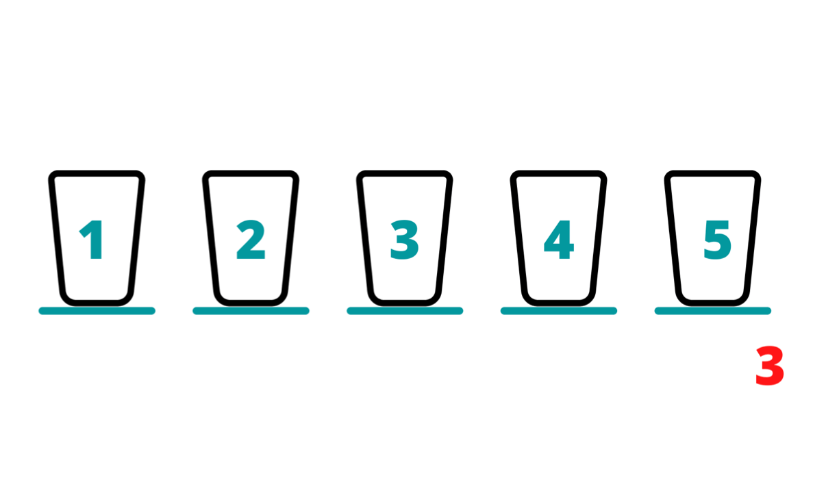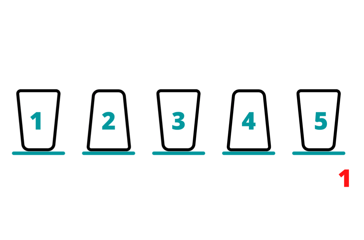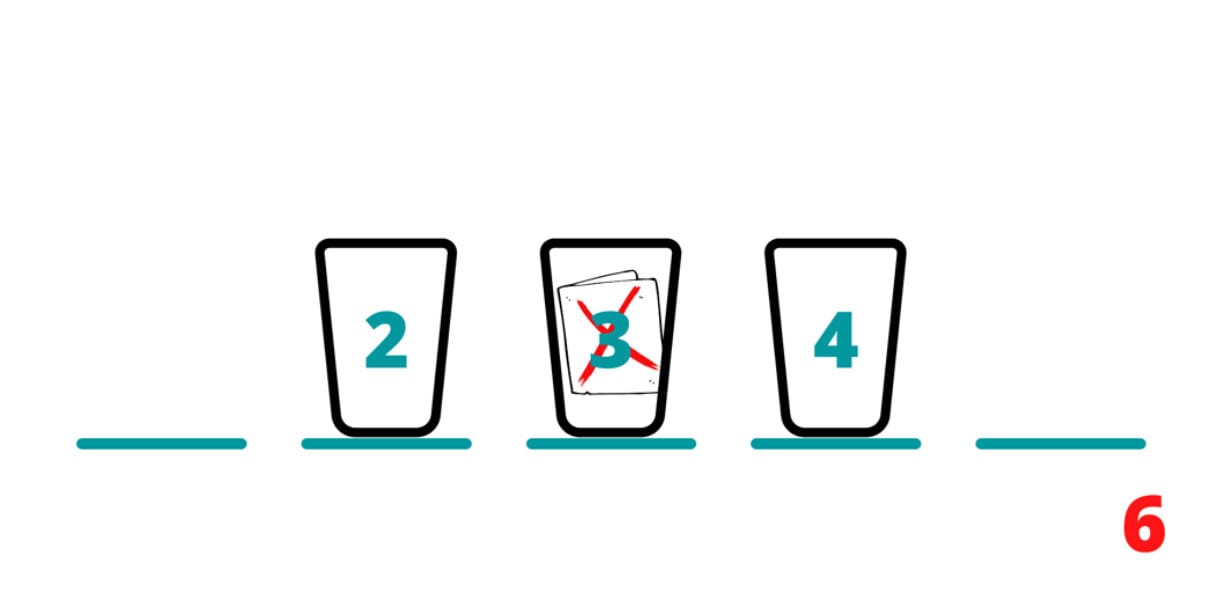 You turn away from the spectator, who now drops the paper into one of the three upturned glasses. At this point, it doesn’t seem like you have much information, but because of the way you arranged the glasses, you know the poison is at an odd-numbered position i.e. 1, 3 or 5.